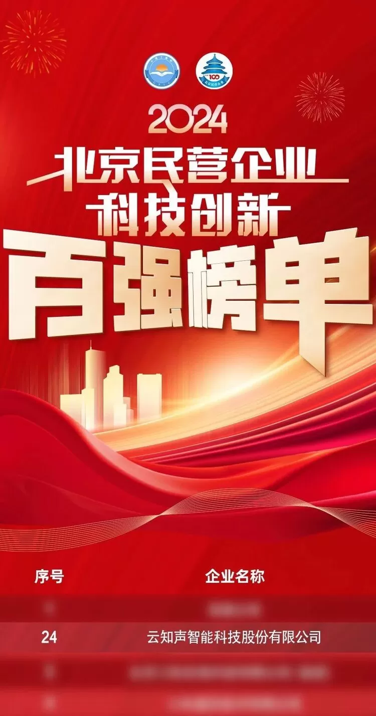 9月26日,北京市工商业联合会、通州区人民政府联合召开“2024北京民营企业百强发布会”,发布北京民营企业“1+4”百强榜单。凭借在人工智能领域的深厚积淀与持续创新,云知声再度入选北京民营企业科技创新百强榜单。
