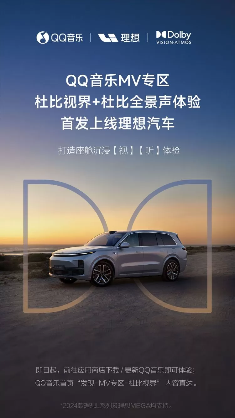 近期,QQ音乐与理想汽车继续深化合作,将杜比视界引入车机端,并首发上线理想汽车。继今年2月,QQ音乐杜比全景声服务上线理想L系列及MEGA车型后,此次杜比视界也将正式支持理想2024款L系列及MEGA车型。这标志着,理想汽车成为国内首个同时支持杜比全景声和杜比视界MV的汽车品牌。即日起,理想车主只需在应用中心将QQ音乐升级至最新版本,即可开启沉浸式移动视听之旅。