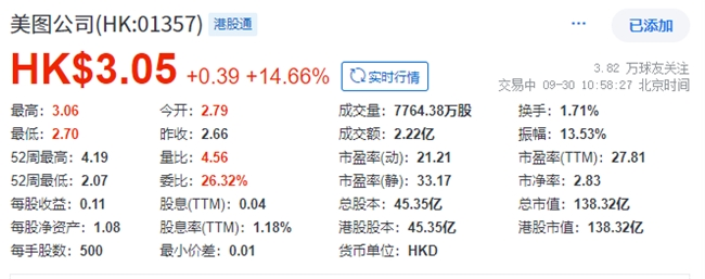 9月30日,美图公司盘中股价大涨15%,截至发稿,报3.02港元,创60日新高,市值超过138亿港元。