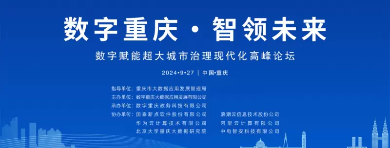 论坛由重庆市大数据应用发展管理局指导,数字重庆大数据应用发展有限公司主办,数字重庆政务科技有限公司承办,国泰新点软件股份有限公司、华为云计算技术有限公司、浪潮云信息技术股份公司、阿里云计算有限公司等单位协办。