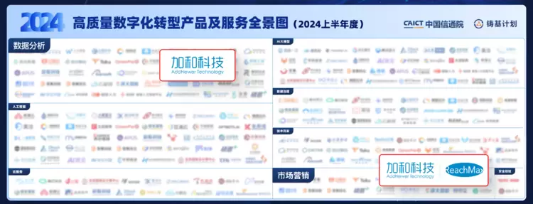 2024年9月24日,中国信通院大模型数字生态发展大会暨“铸基计划”年中会议在北京顺利举办。加和科技受邀出席,荣幸入选了《高质量数字化转型产品及服务全景图(2024上半年度)》。成为【市场营销】、【数据分析】两大关键技术领域的代表企业之一。