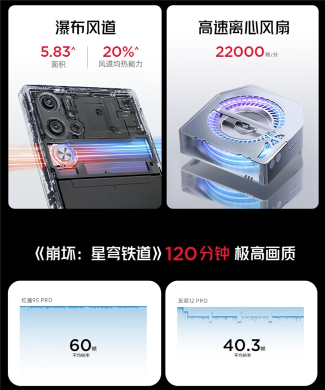 骁龙8 Gen3领先版是高性能的基础保障,而冠以专业电竞游戏手机的红魔9S Pro+,散热方面的极高造诣人尽皆知,高达22000转/分的主动散热风扇与10182mm²冰阶VC,让红魔9S Pro+,有了在《崩坏:星穹铁道》中极高画质平均60帧运行120分钟的底气。