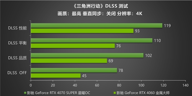 4K分辨率对硬件要求极高。通过数据可得知,影驰 GeForce RTX 4060 金属大师在此分辨率下的表现不足以满足高帧率需求。但借助DLSS技术加持,该卡在性能模式下也能提供较好的游戏体验,达到93FPS的分数。影驰 GeForce RTX 4070 SUPER 星曜OC在4K分辨率下更具竞争力,自身性能输出可实现近80FPS。而在DLSS 性能模式下,帧数直接上涨151.8%。该型号显卡性能优势更为明显,这表明其在高分辨率游戏中具有更强的处理能力。