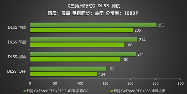 在1080P分辨率下,影驰 GeForce RTX 4060 金属大师帧数表现极为出色。关闭 DLSS时,帧数也能达到134 FPS。在开启DLSS后,值得瞩目的是在性能模式下,帧数显著提升至205FPS,这也证实DLSS 技术的强悍,特别是在低延迟和高响应需求的场景中,能够显著提升游戏性能。影驰 GeForce RTX 4070 SUPER 星曜OC的实力自然不在话下,凭借自身性能性能加持,帧数即可超过150FPS。借助DLSS技术加持后,在品质模式和平衡模式下的帧数均上涨至超过210FPS,性能模式下更是达到了252FPS的高分。整体表现优异,非常适合高帧率游戏体验。