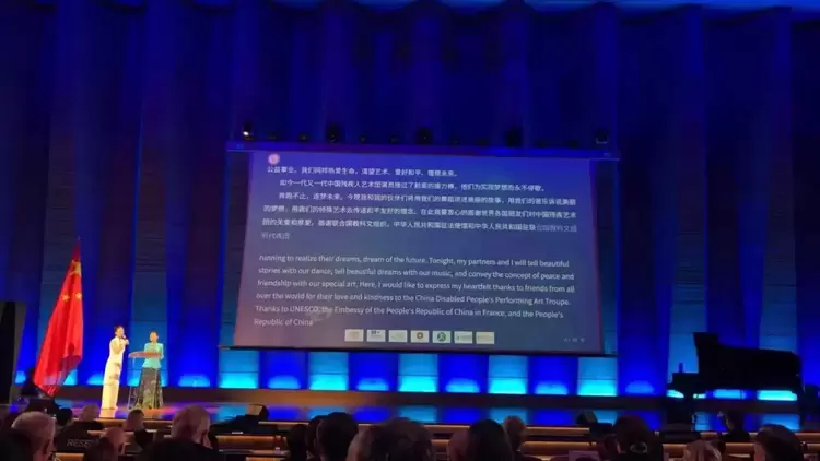 卢大使表示,中国在巴黎残奥会上的优异成绩得益于中国政府长期以来对残疾人事业的高度重视和持续投入。相信中国残疾人艺术团的演出在给大家带来精美艺术享受同时,更会引起我们对残疾人艺术家们自强不息、乐观向上精神的共鸣。中国残疾人艺术团团长邰丽华用手语致辞表示,17年前正是在联合国教科文组织总部,她作为中国残疾人艺术团代表被授予“和平艺术家”殊荣。17年来,艺术团肩负使命,怀抱梦想,走遍全世界103个国家和地区,同时不忘回馈社会,用演出收入支持海内外公益事业。如今,一代又一代中国残疾人艺术团演员为实现梦想而永不停歇、奔跑不止、逐梦未来。今晚残疾人艺术团将继续用舞蹈讲述美丽的故事,用音乐述说美丽的梦想,用特殊艺术传递和平友爱的理念。