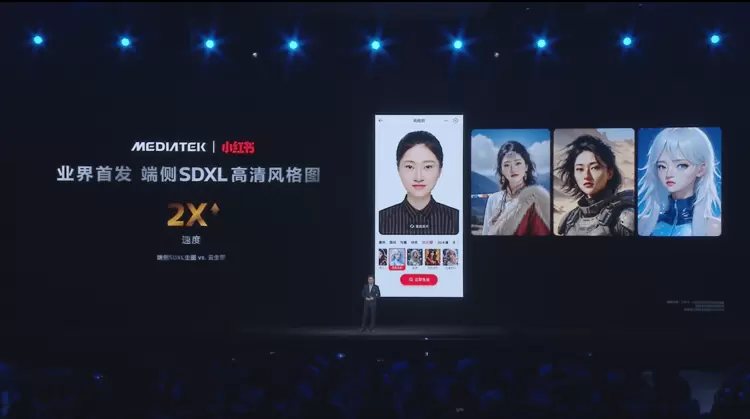 联发科还和小红书深度合作,首发推出端侧SDXL高清风格图,可以将用户的个人照片通过端侧的AI处理生成各种风格的魔幻照片,而且相比云端平均生成时长还要快2倍。