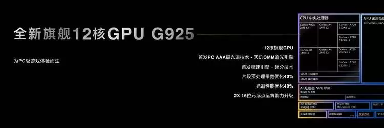 随着联发科全大核旗舰芯片的发布,手机游戏进入到后满帧时代,且拿捏3A已经成为旗舰芯片的必修课。GPU方面,天玑9400搭载全新顶级12核GPU G925,相较上代拥有超过41%的峰值性能飞跃,同时与上一代相同的峰值性能下功耗节省接近一半,不论是跑分测试还是游戏体验,都证明了天玑9400搭载的G925是最强的手机GPU。