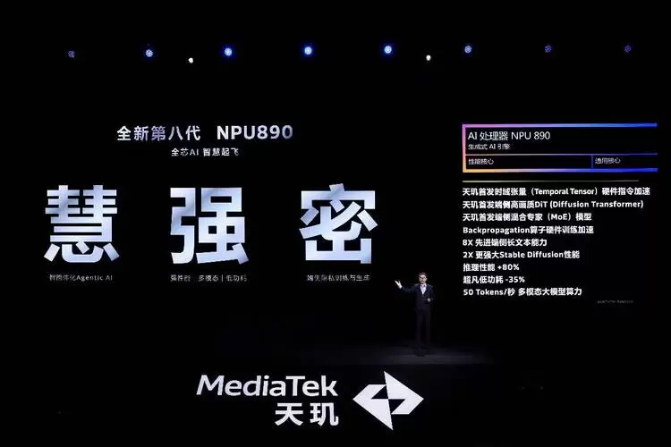 天玑9400搭载了全新的第八代AI处理器 NPU 890,性能和能效提升都堪称恐怖。在苏黎世ETHZ AI Benchmark v6.0 芯片AI性能的测试中,天玑9400以超6500分的成绩冠绝榜首,如此强悍的AI性能,在运行各种热门模型时功耗竟然还能降低35%,轻松拿下手机最强NPU。联发科对于低功耗的重视真是刻到了骨子里,毕竟只有更好的功耗控制,才会有更大的潜力实现各类创新AI应用。