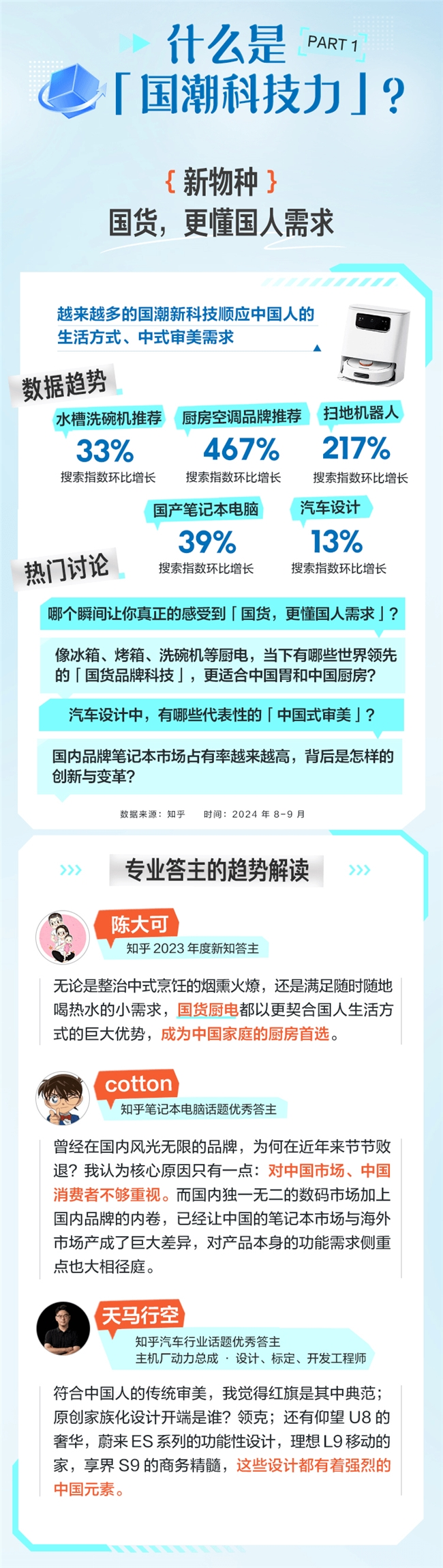 《新职人眼中的国货科技力》报告指出,越来越多的国潮新科技在顺应中国人的生活方式,中式审美也成为一种产品主流。“报告显示,今年8月至9月,厨房空调品牌推荐和扫地机器人的搜索指数环比增长分别为467%和217%”。