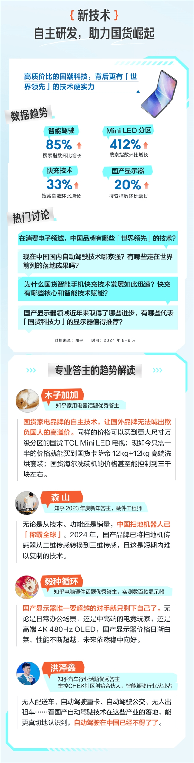 作为以专业讨论为核心的内容社区,知乎上活跃着大量专业的硬件工程师、汽车行业从业者、专业测评答主,也有乐于分享的美好生活家们,他们从亲历者或见证者的角度,分享着“国潮科技力”崛起的秘密以及未来畅想。与此同时,随着这些专业内容的沉淀,知乎已成为国货科技专业讨论的第一平台,在内容洞察和用户数据基础上,不断为用户提供深度、专业的国货科技产品消费建议。