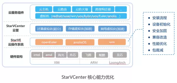 国资委中央企业行业云项目的严苛要求,是对StarVCenter技术实力与创新能力的一次全面检验。项目不仅要求采用全国产化的基础设施,还强调在单一云平台中实现对多种异构国产芯片的高效纳管,以及分布式架构的灵活部署与多地域资源的统一管理。StarVCenter凭借其创新的跨架构超融合调度算法,完美满足了这些技术要求,展现了在信创云领域的深厚底蕴与前瞻视野。