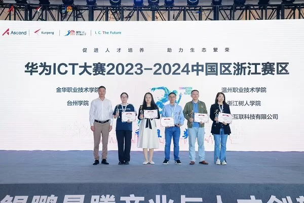 鲲鹏应用创新大赛 2024 浙江区域赛、昇腾 AI 创新大赛 2024 浙江区域赛现场角逐出金、银、铜奖与全国赛通关入场券,政、企、学界嘉宾为鲲鹏、昇腾及华为 ICT 大赛获奖团队颁发奖项。