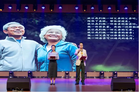 午宴期间还安排了丰富多彩的节目,包括诗朗诵《趁父母还在》、相声《孝道》、歌伴舞《家和万事兴》、情景广场舞《爷爷奶奶和我们》等,深刻表达了对孝道文化的传承与尊重。