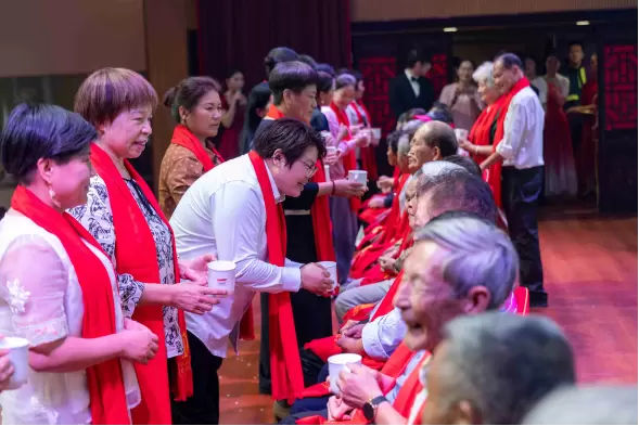 午宴期间还举行了温馨的 “孝道敬茶” 仪式,60 周岁以上且在公历十月份生日的爷爷奶奶们在家人陪伴下走上舞台,家人为其敬茶,表达对长辈的敬爱之情。黄董事长与公司董事会成员共同上台,为寿星们切开生日蛋糕,共同送上“生月”祝福。