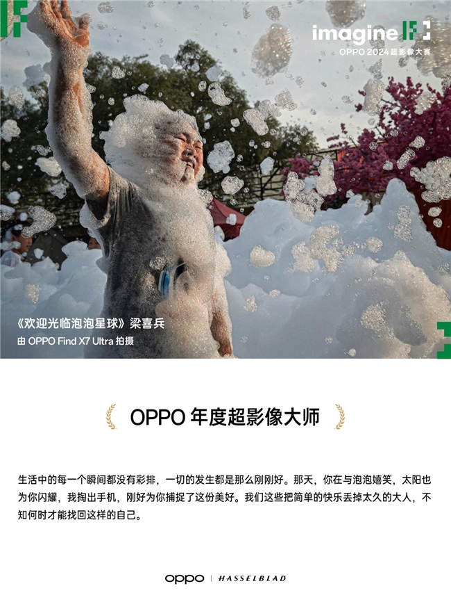 2024年10月10日,备受全球摄影爱好者关注的2024 OPPO超影像大赛获奖作品名单正式公布,经过7位专业评委的评议,作品《欢迎光临泡泡星球》最终夺得金奖,收获17万奖金。