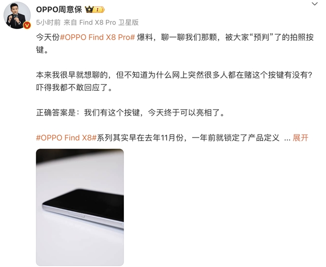 OPPO Find系列产品负责人周意保最近也是分享信息:OPPO Find X8系列将配备抓拍快启键,这个抓拍快启键足够好用,按压力度和位置做得刚刚好,横屏和竖屏时都能够快速的摸到这个按键,从而可以快速启动。