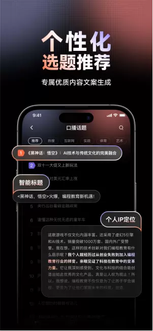 文案生成功能支持用户根据特定话题生成口播文案脚本。该功能可关联用户定制的IP人设,并在文案中融合开场白介绍、行业和业务、风格调性、个人理念、Slogan等个性化内容,一键生成基于IP人设/背景/口吻的定制口播文案,快速打造个人IP。