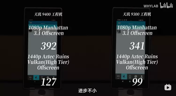 再来看WHYLAB对于天玑9400的GPU和游戏测试成绩。对比天玑9300,从1080P曼哈顿(3.1)和1440p Aztec(Vulkan)的离屏渲染帧数来看,天玑9400的进步很大。