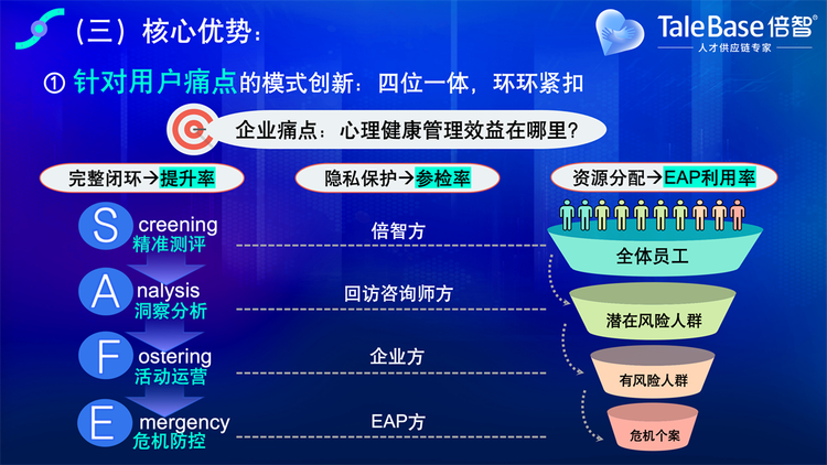 作为荣获本次大赛激活组一等奖的项目,倍智S·A·F·E心理体检项目是一项创新性的企业心理健康支持服务,它通过独特的服务模式、理念和技术,为企业提供全方位、个性化的心理健康解决方案。项目构建了一个“四位一体”的心理健康服务体系,涵盖“精准测评”以深度洞察员工心理状态,“洞察分析”以发掘组织潜在问题,“活动运营”以增强企业积极文化氛围,和“危机防控”以有效应对突发心理事件,为企业提供全面周到的心理健康支持。