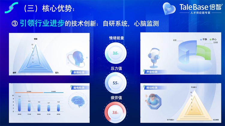 在技术层面,项目依托倍智自主研发的TAS智选系统,实现高效的测评实施与智能数据分析。同时,通过运用最新的AI多模态技术,综合分析员工的表情、声音、眼动及脑电等多维度数据,显著提升了测评的精确度和深度,为企业提供更科学、更精准的心理健康解决方案。