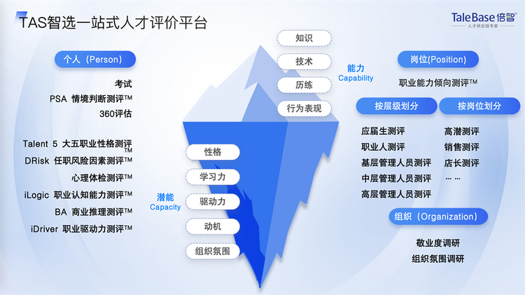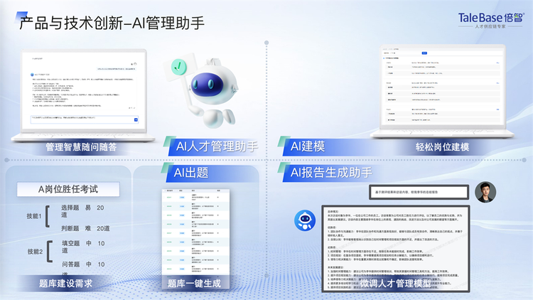倍智TAS智选全面覆盖企业管理人员、HR、测评师及被测人员四大关键角色,提供了包括心理测评、360评估、AC评价、考试调研等全面的人才测评功能。同时,平台以人才为核心,助力企业构建人才数据资产,实现人才档案与画像的精准管理,以及人才数据的多维分析,为企业人事决策提供有力支持。凭借AI大模型的强大助力,TAS智选支持AI建模、自动出题、报告生成以及智能人才管理助手等多项创新功能,为企业带来更高效的测评体验。