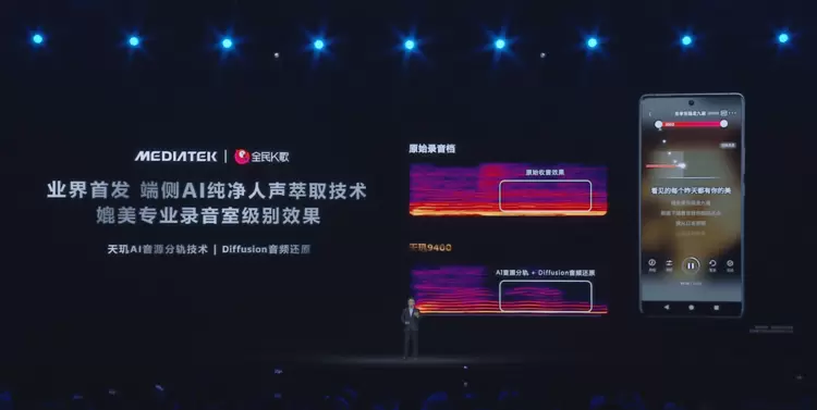 此外,联发科还和全民K歌深度合作,首发推出端侧AI纯净人声萃取技术,通过天玑AI音源分轨技术,将K歌时的人声提取出来,再搭配stable diffusion算法做人声还原,可以打造出纯净动听的歌声,然后再搭配音乐混音, 可以为用户提供媲美专业录音室的的K歌作品,让唱歌爱好者用手机就可以享受媲美专业录音室级别的效果。
