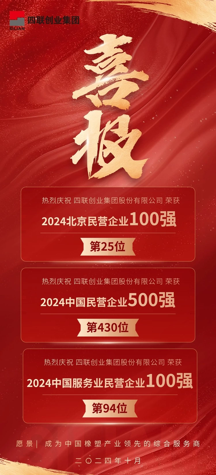 2024年10月11日-12日,以“弘扬改革精神 建设一流企业”为主题的2024中国民营企业500强发布会暨全国优强民企陇上行活动在兰州举行。由全国工商联评选的2024中国民营企业500强、中国服务业民营企业100强等榜单在本次会上隆重发布。四联创业集团股份有限公司(简称“四联创业”)以317亿元的营收位列2024中国民营企业500强第430位、中国服务业民营企业100强第94位。同时,在日前发布的2024北京民营企业100强榜单中,四联创业仍然保持前列,排名第25位。