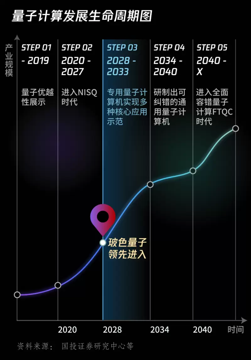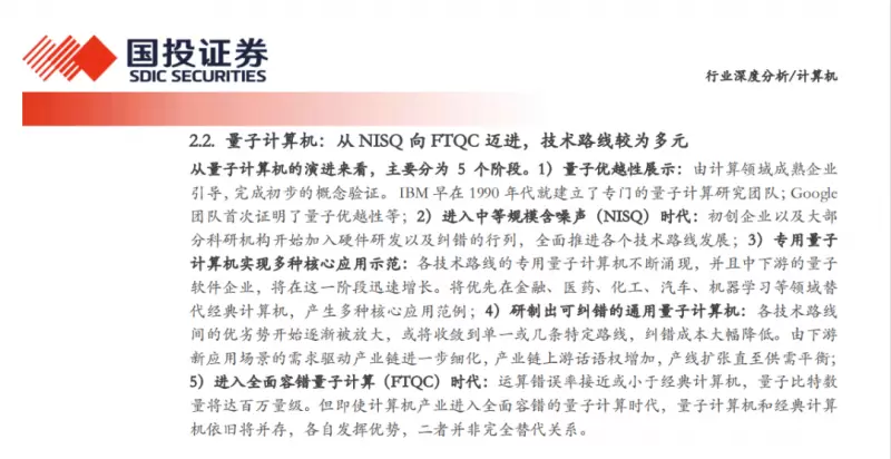 2024年7月,国投证券发布的《量子科技:见微知著、革故鼎新》研报中提到,从量子计算机的演进来看,主要分为五个阶段:-2019年,量子优越性展示阶段;2020-2027年,进入中等规模含噪声(NISQ)时代阶段;2028-2033年,专用量子计算机实现多种核心应用示范阶段;2034-2040年,研制出可纠错的通用量子计算机阶段;2040-,进入全面容错量子计算(FTQC)时代阶段。