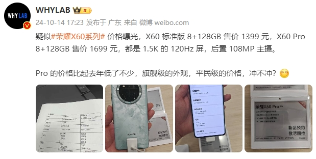 荣耀X60系列疑似价格曝光:卫星通信、青海湖电池、绿洲护眼屏加持,明天正式发布!