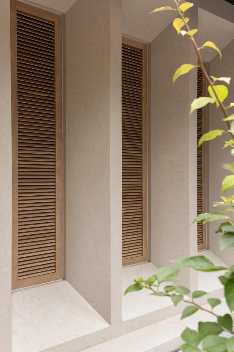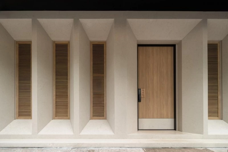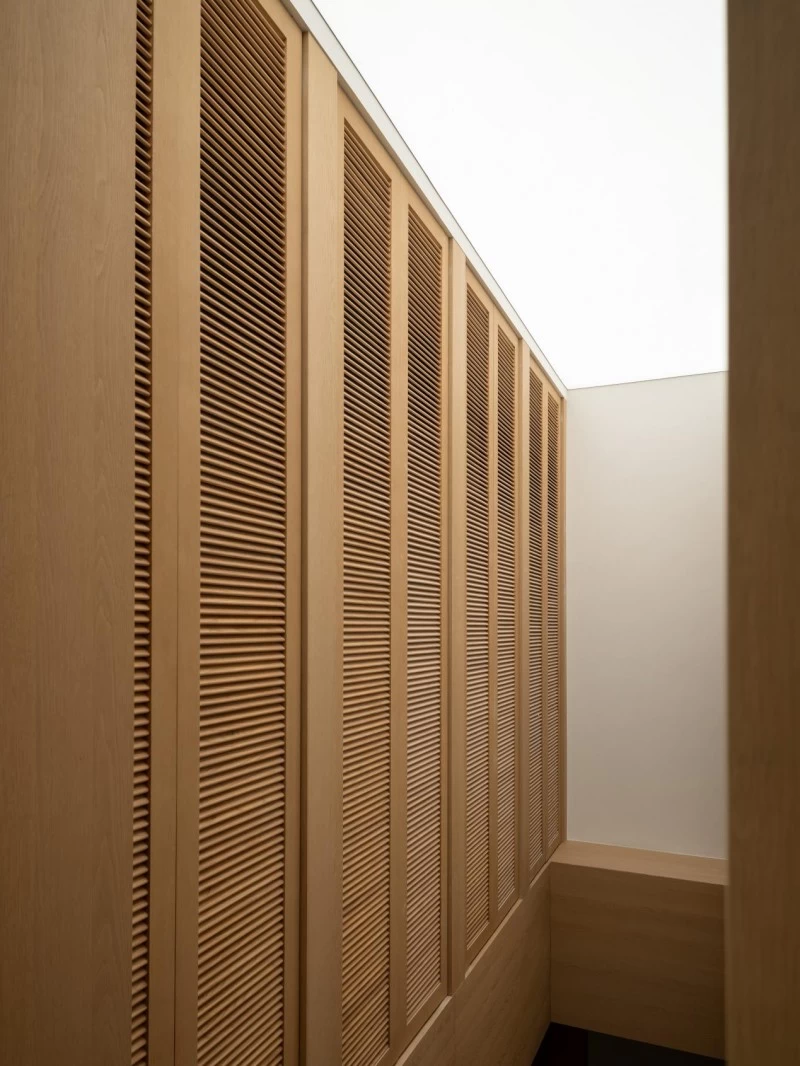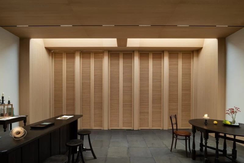 木色的百叶门以并列的排布,展现出简洁、大气的平面美,且百叶门层层叠覆式的设计,也自带韵律和中式的隐约含蓄。