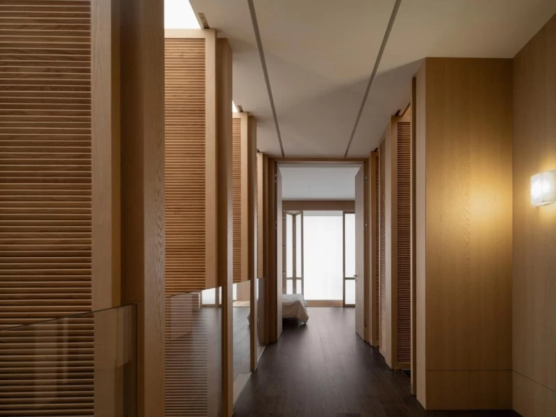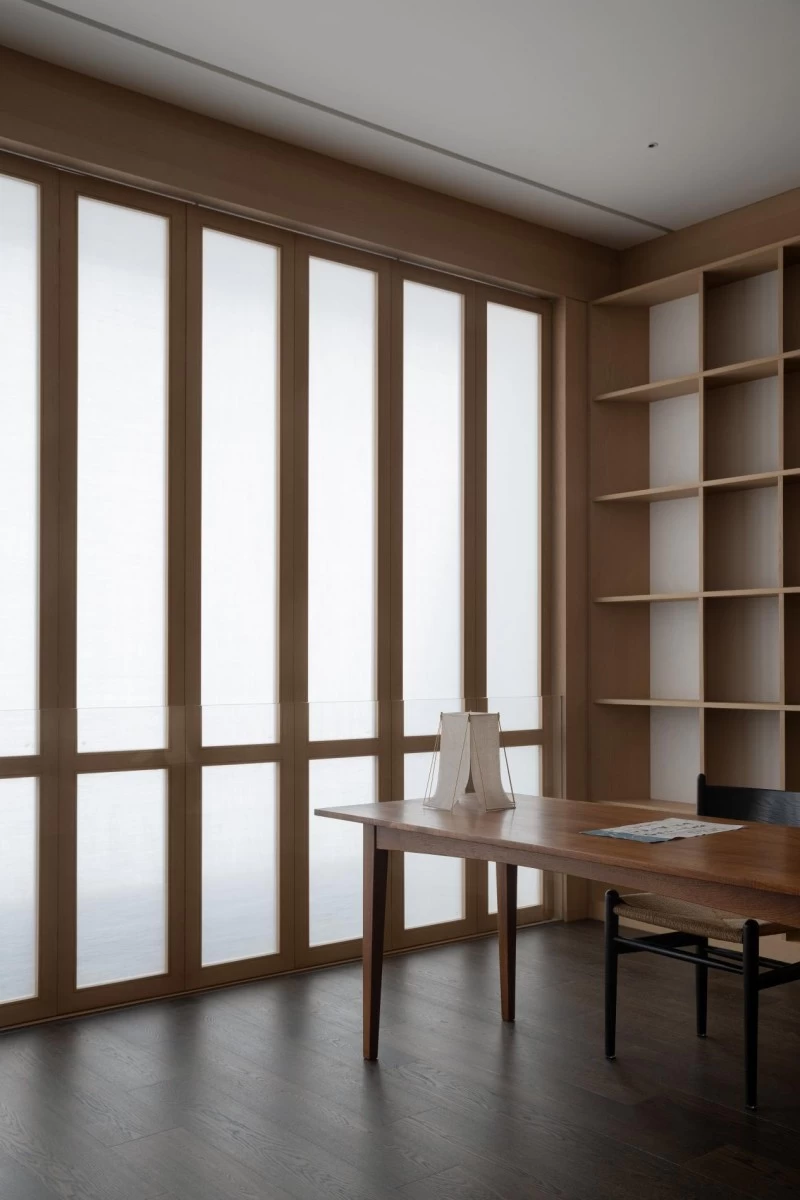 木色串联着每一个空间,且天光与百叶窗的搭配,予以了空间更为通透的采光,包括百叶窗塑造的呼吸感,也让空间清透而又丰盈。
