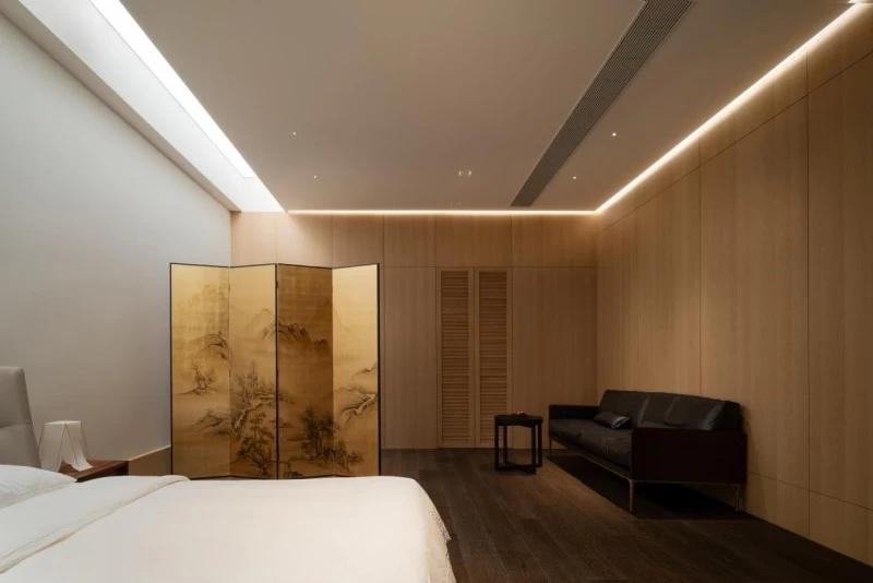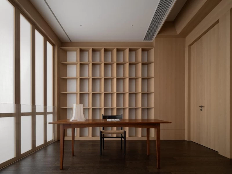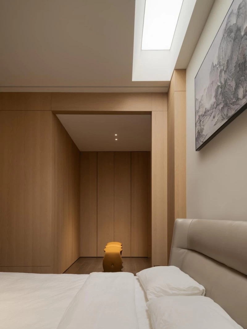 将茶室搬进卧室不仅仅是延伸了功能,同时也是给予了心灵寄情抒发的出口,整个空间依旧延续木质色调的清雅温润,且门墙与茶柜形成一体化的整体视觉,本质上来说这也是一种对空间秩序的整理。