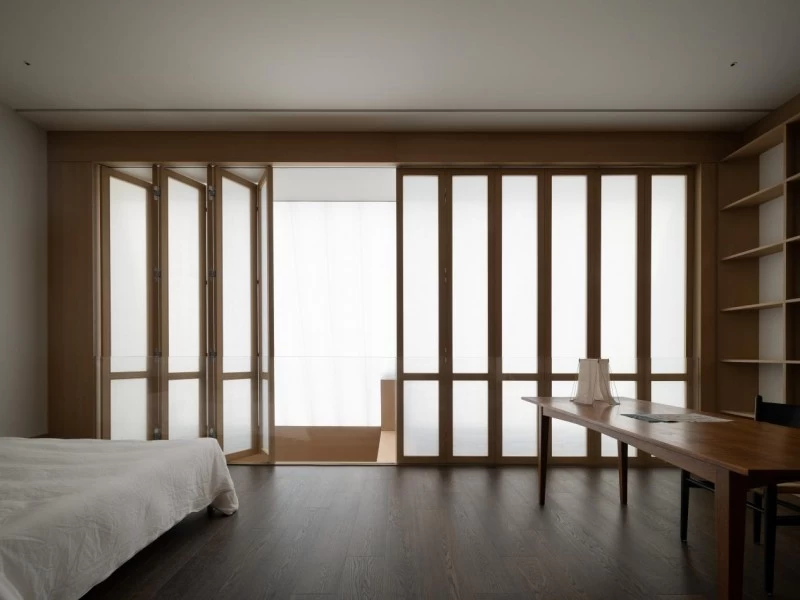 木质的多扇折叠门,搭配玻璃,完美呈现发光板的光影效果,光影虚实间,平添几分意境之美,也让人和空间都得以滋养。