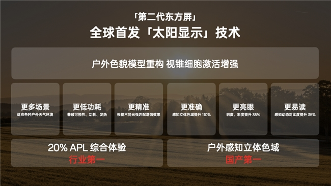 高亮可见一直是许多用户的用机痛点,在诸如太阳直射的极端高亮户外场景中,许多屏幕无法看清,用户不得不转移到室内环境或者放弃使用手机。针对这一问题,第二代东方屏全球首发太阳显示技术,即使身处夏日户外高亮环境下,第二代东方屏也能保证屏幕内容清晰可见,并能根据环境色温精准还原色彩,彻底摆脱户外用屏看不清、看不准的问题,大幅提升户外可见度。