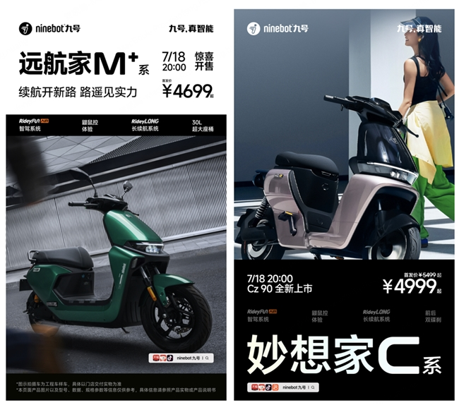 而九号旗下另一品牌Ninebot九号,也带来多款高端智能的电动车新品,如远航家M+、妙想家C系(国标电自版)、Nz90、Vz MIX,这几款产品不仅加入了品牌自研的RideyLONG长续航系统,解决了用户的续航焦虑,更搭载了RideyFUN AIR智驾系统、鼹鼠控功能等智能骑行辅助功能,让用户骑行更高效安全。