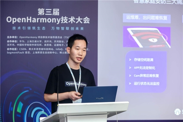 湖南开鸿智谷数字产业发展有限公司研发中心产品研发部部长蔡志刚向现场观众进行“分布式相机OpenHarmony统一互联实践”的分享。蔡志刚围绕智慧城市、智慧家庭、智慧园区等商业化场景,基于上海海思不同芯片不同设备,展示了如何通过OpenHarmony的核心软件能力实现互联互通,为未来OpenHarmony生态商业化拓展提供了丰富的案例。