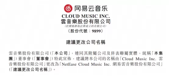 10月15日,网易云音乐在香港的上市主体云音乐股份有限公司发布公告,董事会建议将该公司名称由「Cloud Music Inc.云音乐股份有限公司」更改为「NetEase Cloud Music Inc.网易云音乐股份有限公司」。公告称,变更后公司名称将与其标志性产品网易云音乐保持一致,有助于资本市场更好识别本公司并更快捷地获取相关交易资料,及加强公司整体品牌,为股东创造长期价值,符合公司及股东的整体最佳利益。