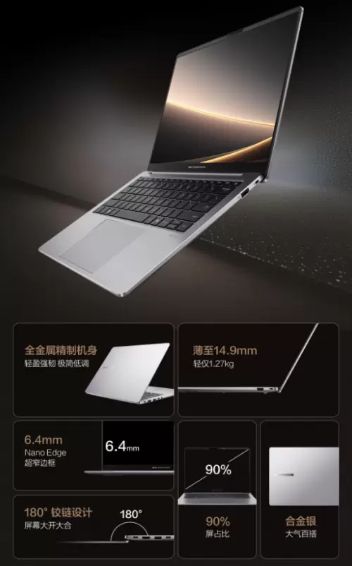 华硕破晓6 Pro采用全新金属轻薄机身,轻约1.27Kg,薄至14.9mm,丝滑开合,轻松携带,一只手即可装入背包或公文包内,各种场合轻松应对。外观搭配合金银配色,机身A面贴合铭文LOGO,简约时尚尽显商务风范。同时它支持180°屏幕开合,便于演示分享高效沟通工作成果,无论是出差会议还是商务洽谈,华硕破晓6 Pro都能成为你专业的社交名片,展现超凡气质。