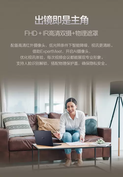 它自带的FHD+IR高清双摄,不仅支持人脸识别功能,还可借助ExpertMeet,开启AI摄像头,低光照条件下实现智能降噪,优化视讯体验,让用户每次视频会议都能展现专业形象。