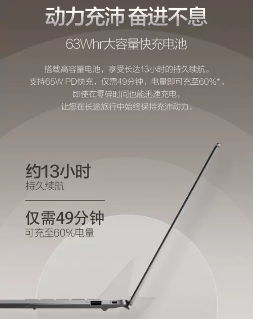 同时得益于这款处理器的MOP封装架构设计,在英特尔硬件线程调度器的调配下,可实现50%功耗降低,以及2倍的能效提升,在63Whr快充电池的加持下,享受13小时的持久续航。如果沿途中出现电量告急的情况,这款华硕破晓6 Pro还支持65W PD快充技术,仅需49分钟,可回电至60%,只需在附近的咖啡馆、快餐店即可完成碎片化充电任务,保证你的旅行长途无忧。