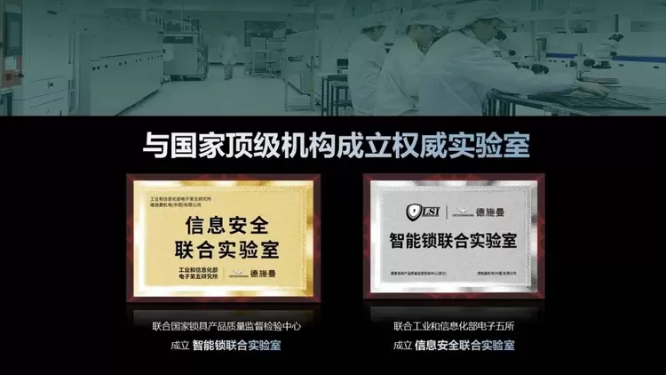 同时,德施曼于2019年联合工业和信息化部电子五所成立信息安全联合实验室,联合国家锁具产品质量监督检验中心成立智能锁联合实验室,共同推动智能家居行业的标准统一与强化智能化识别系统研发的要求。