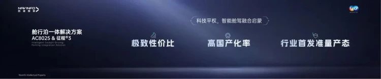 第二款是舱行泊一体解决方案。北京车展上,我们对它做了静态展示,现在已经成功上路、进入到准量产状态。该方案把性价比做到极致,也是国产化率最高的舱驾融合产品之一。芯片用了杰发科技的AC8025+合作伙伴地平线征程3芯片,整个域控国产化率超过70%。目前,这个产品已经是量产状态,可以快速移植开发,帮助车企把研发速度、研发人员投入减一半。我们评估6-9个月,就可以为车企客户做好适配开发。