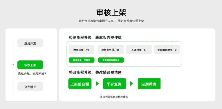 在审核上架环节,涉及上架前、上架后多个关键节点,OPPO 为开发者提供标准化隐私合规检测服务,助力开发者隐私合规检测效率提升了30%。通过健全人机衔接流程,OPPO过审时间也将大大缩短。