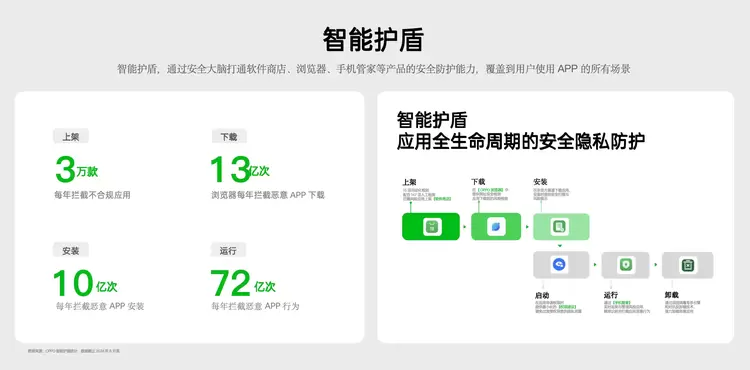 针对应用内安全,此前,OPPO已将包括终端环境安全检测、恶意URL检测、移动应用加固服务、日志防泄漏的安全能力向开发者全面开放。而在今年3月发布的《OPPO智能护盾应用安全治理白皮书》中也提到,OPPO建立起了以OPPO智能护盾为底层能力的安全隐私全流程全场景防护体系,覆盖应用上架、安装、运行到卸载各个环节,为应用安全治理提质增效。