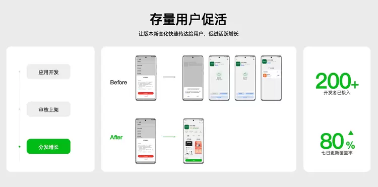 在数据上,省略诸多繁琐步骤后,OPPO软件商店七日更新覆盖率80%以上,版本激活率提升22%。
