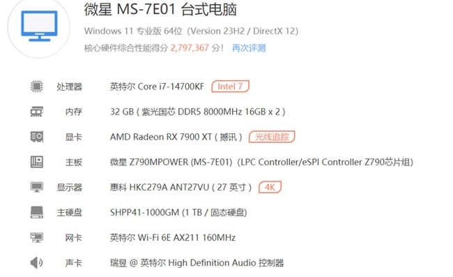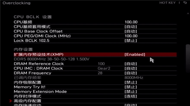 我手里这套配置是i7-14700KF搭配撼讯RX 7900 XT显卡,考虑到超频需求,选择了微星的Z790 MPOWER双槽主板。开机进入BIOS后,只需找到超频相关设置并开启内存的XMP选项,就能一键释放墨云藏境系列的全部实力,非常方便。我这套是8000 MT/s版本,预设的时序为38-50-50-128,电压1.5V。