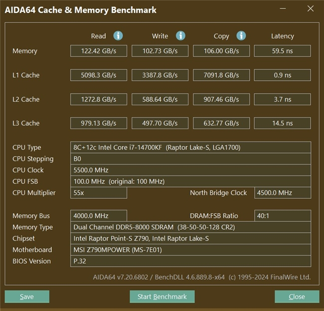 在AIDA64内存基准测试中,墨云藏境系列8000 MT/s高频无疑给最终的成绩加分不少。读取、写入、拷贝三项都达到了GB/s级别,分别为122.42 GB/s、102.73 GB/s、106 GB/s,而且延迟也不到60 ns,理论表现堪称第一梯队。