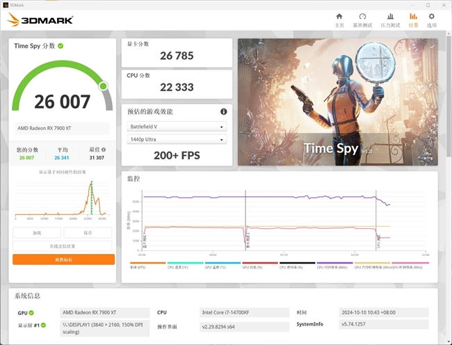 理论游戏测试中,3DMARK Time Spy分总分高达26007分,GPU和CPU分别得到26785分和22333分,且成绩要高于相同硬件的测试结果。