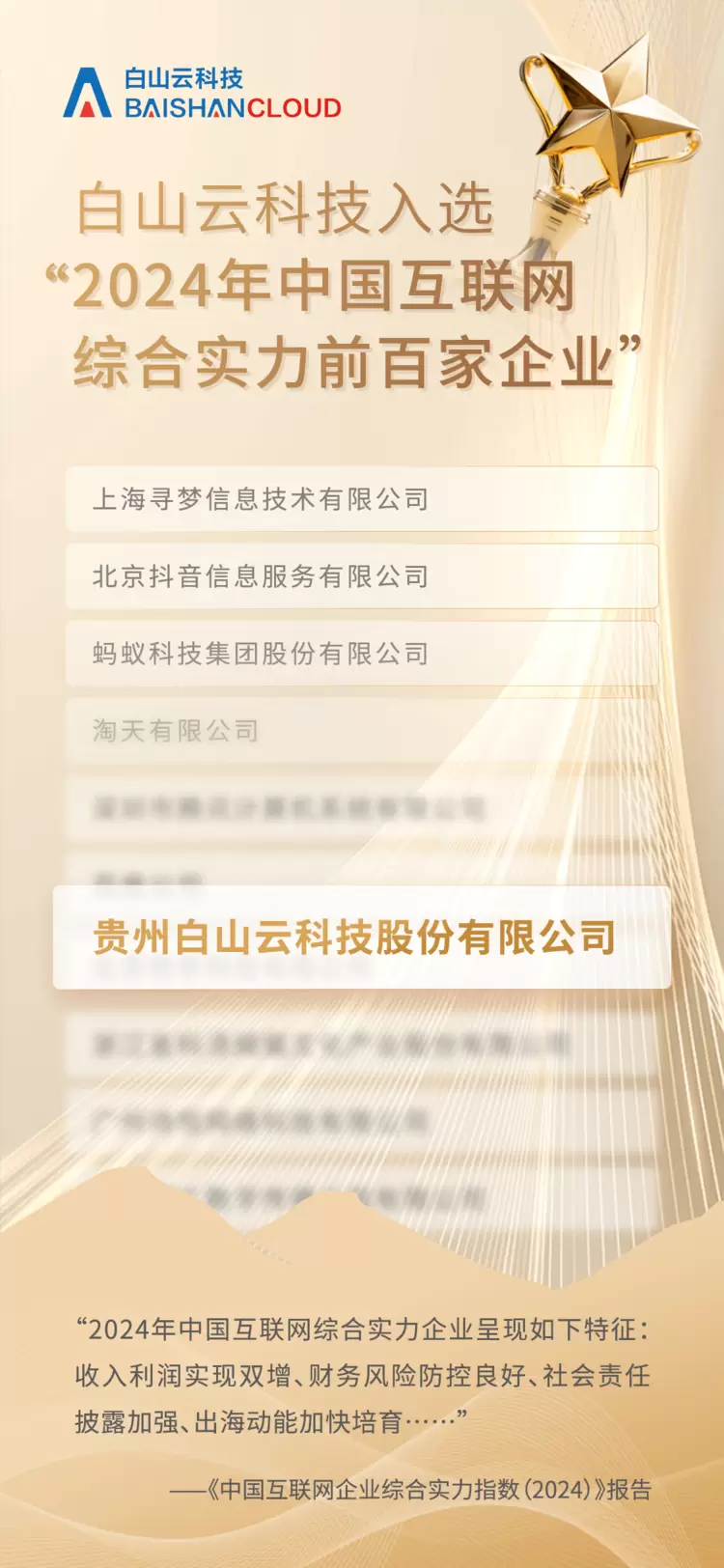 10月17日,备受瞩目的“2024年中国互联网综合实力前百家企业”榜单正式揭晓。白山云科技凭借持续稳健的市场表现、海外业务的快速增长、领先的技术创新积累、积极的企业社会责任担当再度入选。