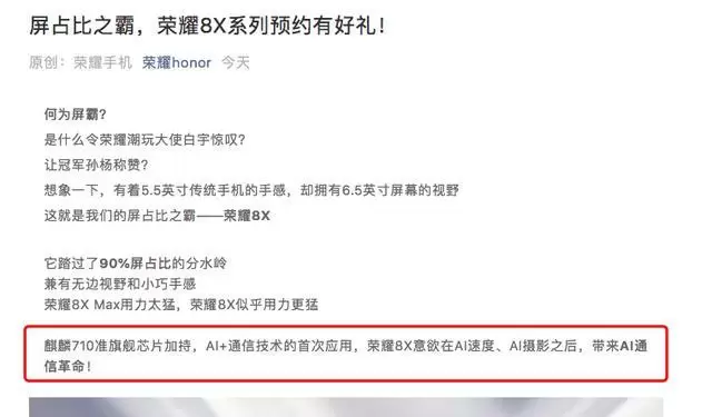 昨天下午,荣耀官方微信发布的预约文章为我们揭开了荣耀8X强大配置的神秘面纱。除了证实之前就有爆料的6.5英寸屏幕、超过90%以上的屏占比以及麒麟710处理器之外,还公布了荣耀8X将采用AI+通信技术。